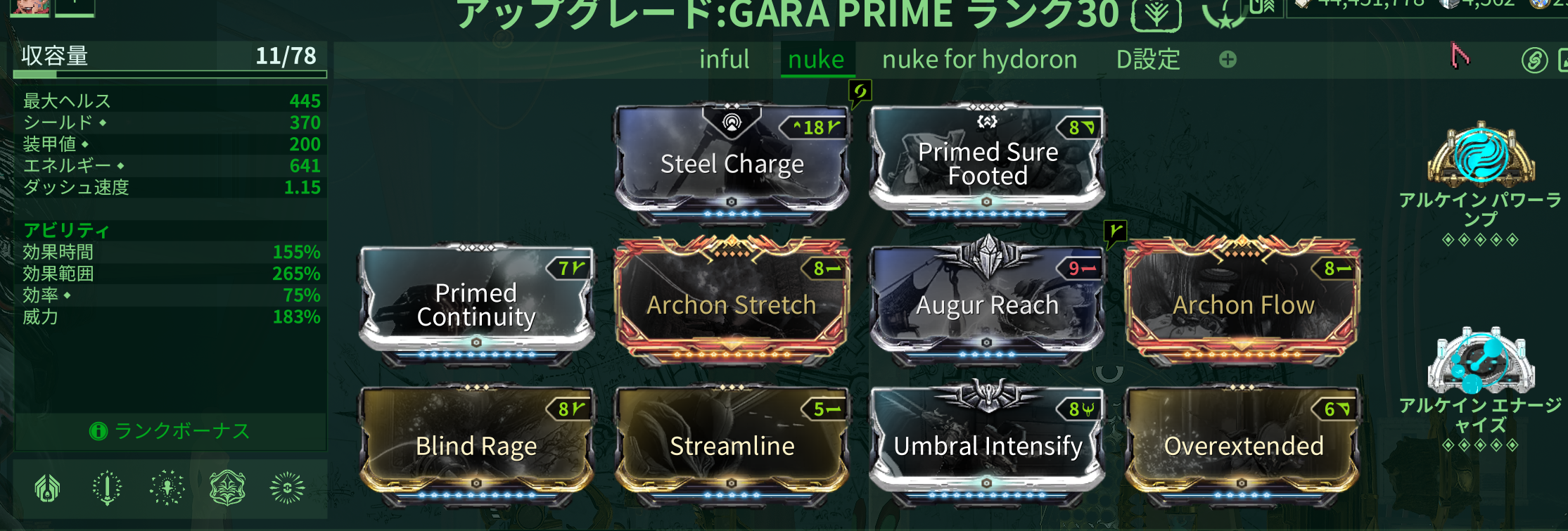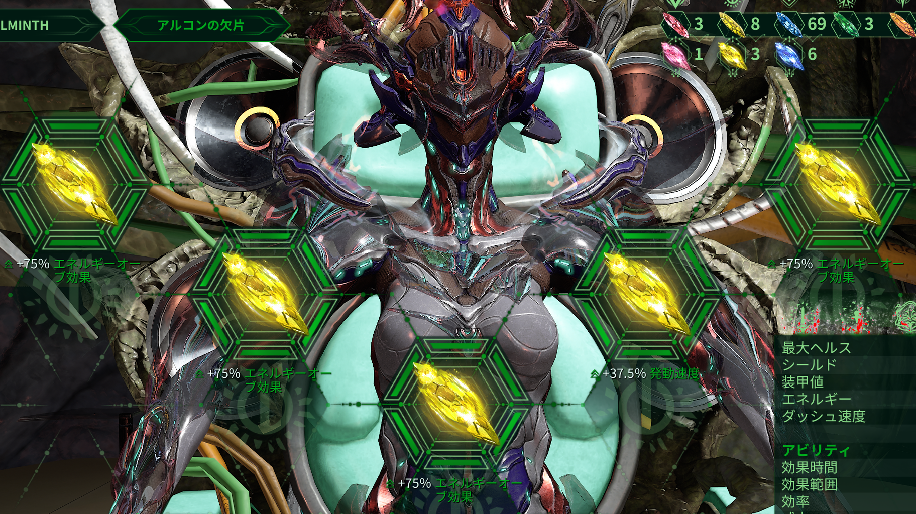 アルコン破片が重要でBR込のビルドではエネルギーが不足するのでヤケクソのようにエネルギーオーブ効果上昇を入れる。