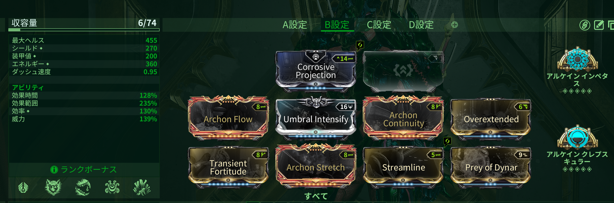 毒状態異常はアルコン破片の毒状態異常ダメージ増加の効果を「2番付与時」「SickeningPluse時」「拡散時」「拡散後のSickeningPluse時」の4回受けられるためこれも強力。ArchonCountinutyで腐食を付与し、SickeningPluseでそれを10に増やせるのも追い風。