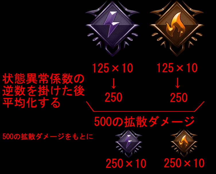 ・2番で付与したDoT状態異常の平均値の和を「拡散ダメージ」として与える。